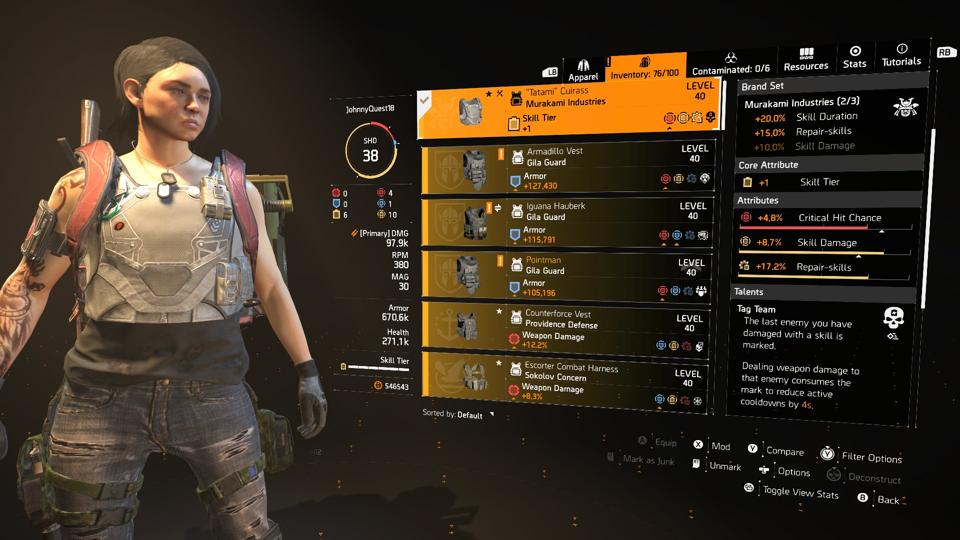 Division 2 Cheaters Banned for One Week with a Progress Reset. Hey everyone On Monday I started playing around in excel creating a build tool to ease my in game UI frustration. Individual pieces of gear often lend themselves to specific playstyles in The Division 2 and if you combine powerful loot in the right ways you can create a character that excels in a particular role.